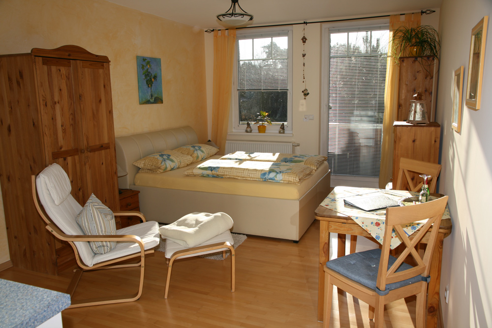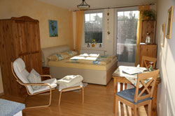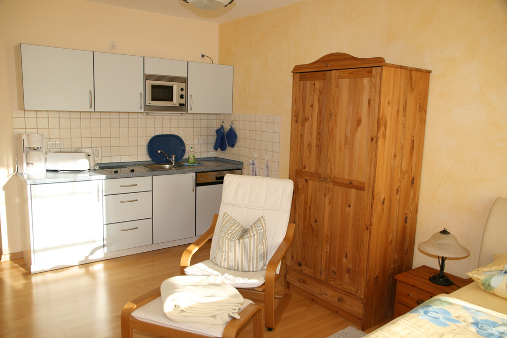 Austattung: - Hochwertige Einbauküche: (Cerankochfeld/Kühlschrank mit Gefrierfach/Mikrowelle/Geschirrspülautomat/Wasserkocher/Toaster/Kaffeemaschine) - Ess- und Couchtisch - Fernseher mit digitalem Satellitenempfänger + Digitalradio, DVD/CD-Player- Bad mit Dusche, WC, Fön und Handtuchtrockner - Balkonmöbel aus Hartholz fürs Frühstück draußen - Doppelbett (1,60m breit) - Hinweis: die genannten Preise gelten bei Belegung mit EINER Person, eine zweite Person kostet pro Tag 10€ zusätzlich |